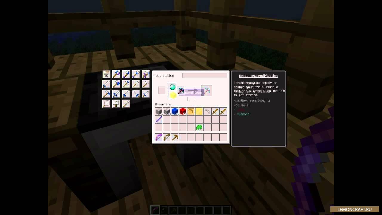 Глобальный мод Tinkers Construct предназначен для создания большого количества различного инструмента. Созданый инструмент вы можете назвать как вашей душе угодно. После того, как инструмент был создан - он ваш на все время игры. В моде присутствуют две книги, изучив которые вы сможете без проблем создавать нужные вам инструменты.