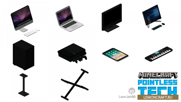 Мод на современную технику Pointless Tech добавит в игру большое количество новой техники, которая скопирована с реальных образцов. Теперь вы сможете декорировать свой дом, превратив его в настоящий высокотехнологичный дом. Например вы сможете установить синтезатор, колонки, игровые приставки, планшеты, компьютеры, мониторы и много чего еще интересного. Все инструменты и предметы прорисованы очень качественно и выглядят вполне реалистично.