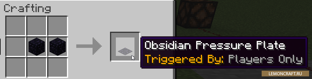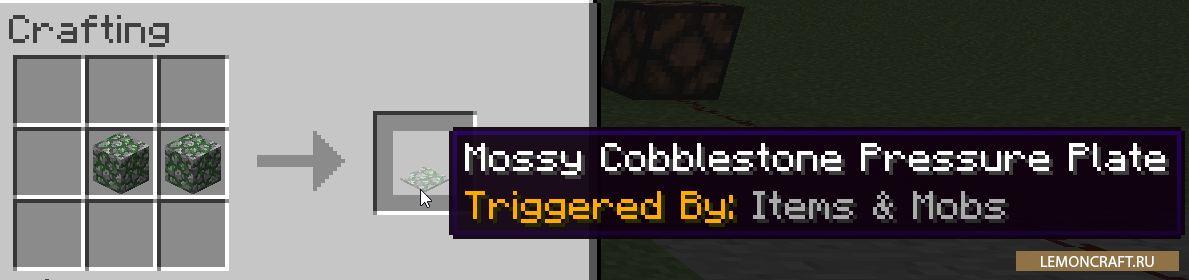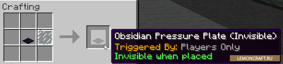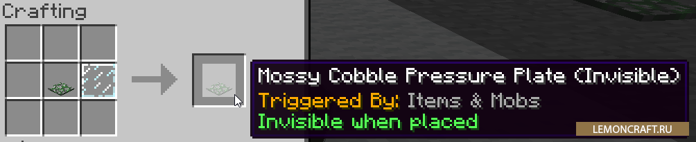 Мод на нажимные плиты Player Plates добавит в игру нажимные плиты из различных материалов. Будут добавлены плиты, которые будут реагировать только на игрока, эта плита сделана из обсидиана. Следующая плита сделана из камня и мха, она реагирует на мобов и предметы. Третья и четвертая плиты - аналоги первой и второй, только невидимые. Теперь вы сможете создавать различные ловушки или потайные проходы.