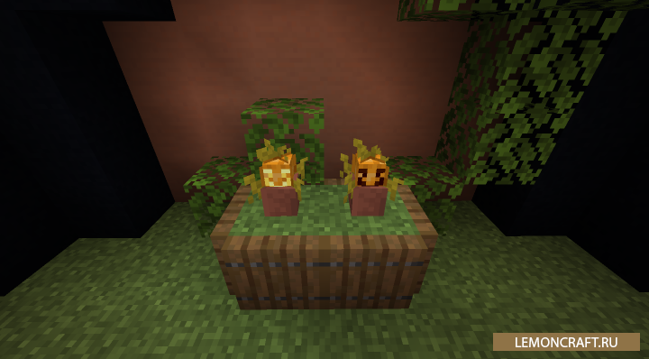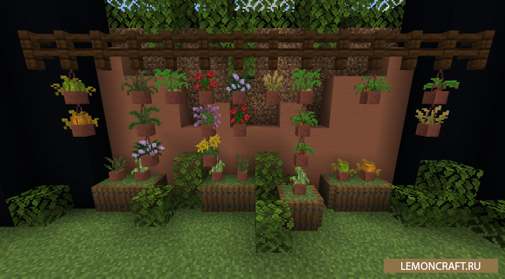 Мод на горшки для растений Florist посвящен всем тем, кто любит возиться с цветами и хочет украсить свой дом разными растениями. В игре появится горшок для цветов скрафтить который можно из трех кирпичей. Полученный горшок вы сможете подвесить или поставить на поверхность. Кроме цветов в горшок вы можете посадить тыкву, что выглядит очень прикольно.