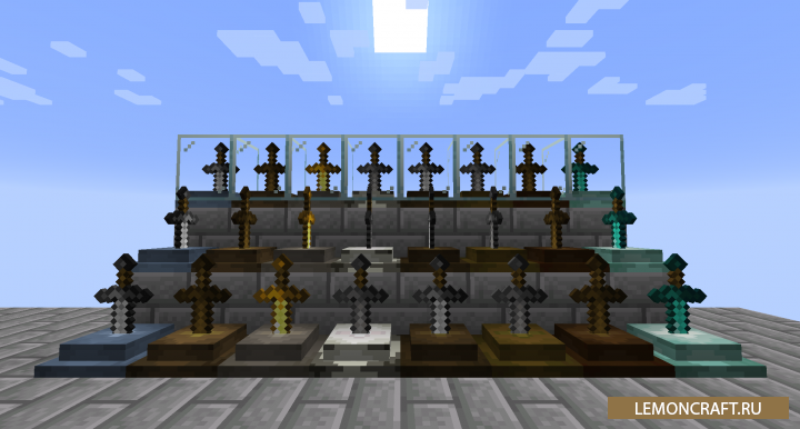 Мод на подставки для мечей Sword Displays отлично подойдет для тех, кто собрал в своем арсенале большое количество мечей. Мод добавляет несколько вариантов пьедесталов для мечей, которые украсят любую комнату в вашем строении. Для установки меча на пьедестал нужно взять его и нажать ПКМ, для обратного действия нажмите сочетание клавиш SHIFT+ПКМ.