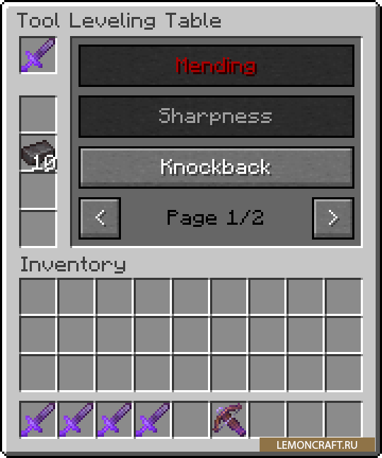 Мод на повышение уровня зачарований Tool Leveling+ добавляет в игру новый блок, который позволит повысить уровень зачарования на несколько уровней выше ванильного. Для этого достаточно выбрать нужные чары и использовать нужный материал, по умолчанию это слитки незерита.