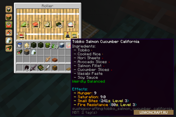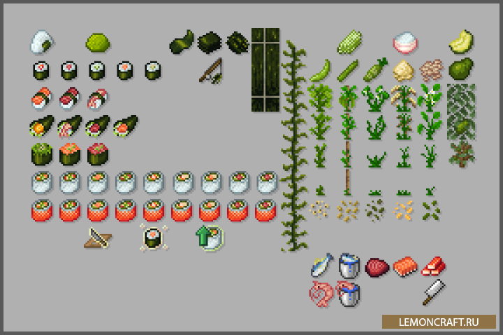 Мод на суши Sushi Go Crafting довольно интересная модификация, которая позволит приготовить суши и роллы используя новую механику. Теперь вы сможете собирать блюдо по ингредиентам, от чего будут зависеть индивидуальные характеристики полученного блюда (голод, получаемые эффекты).